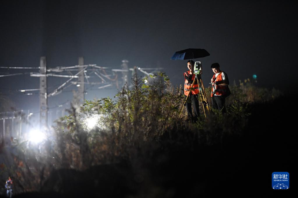 9月1日凌晨,施工人員在重慶鐵路樞紐東環(huán)線(xiàn)磨心坡站作業(yè)。新華社記者 王全超 攝