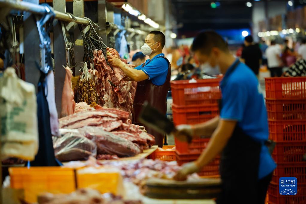 9月2日清晨,成都農產(chǎn)品中心批發(fā)市場(chǎng)商戶(hù)在準備肉類(lèi)產(chǎn)品。