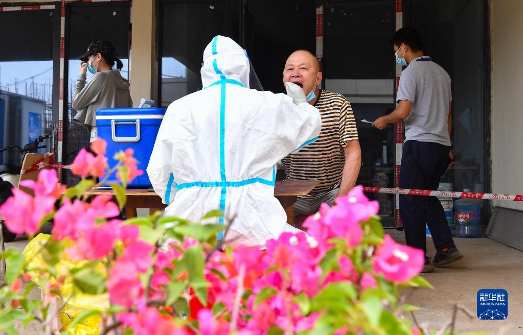 9月2日,在??诮瓥|新區東寨新居一期項目,工人排隊進(jìn)行核酸采樣。