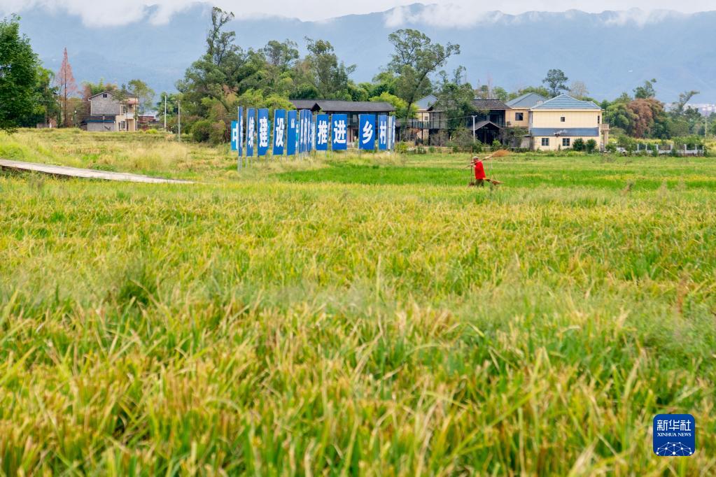 9月1日,在重慶市梁平區安勝鎮,村民從再生水稻田中走過(guò)。