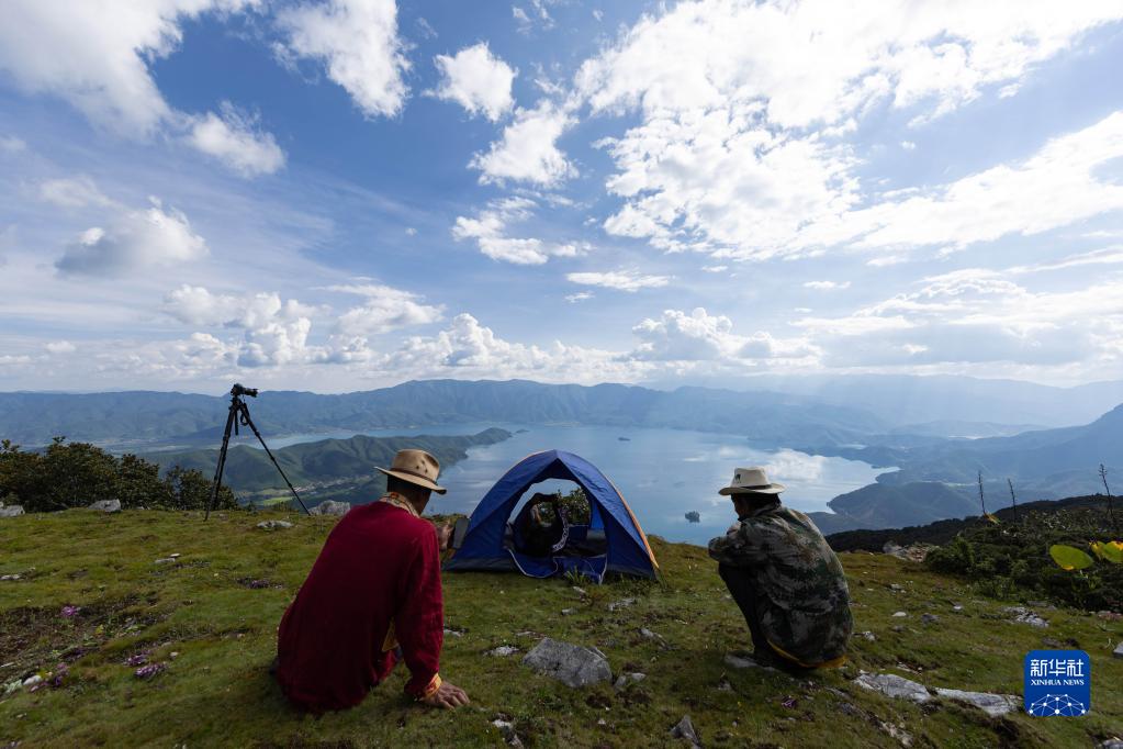 在牛窩子山山頂,瀘沽湖馬幫隊隊長(cháng)楊直之(左)和隊員郭世拉陪著(zhù)一名游客遠眺瀘沽湖(9月1日攝)。