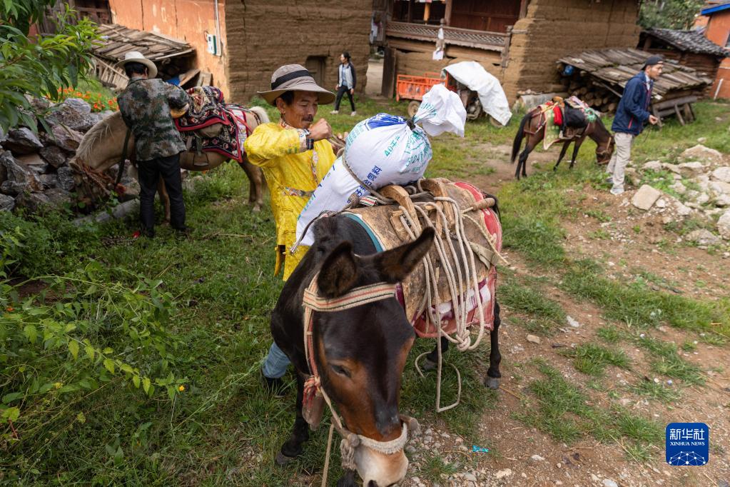 在鹽源縣瀘沽湖鎮木垮村,瀘沽湖馬幫隊隊員打包行李準備出發(fā)上山(9月1日攝)。