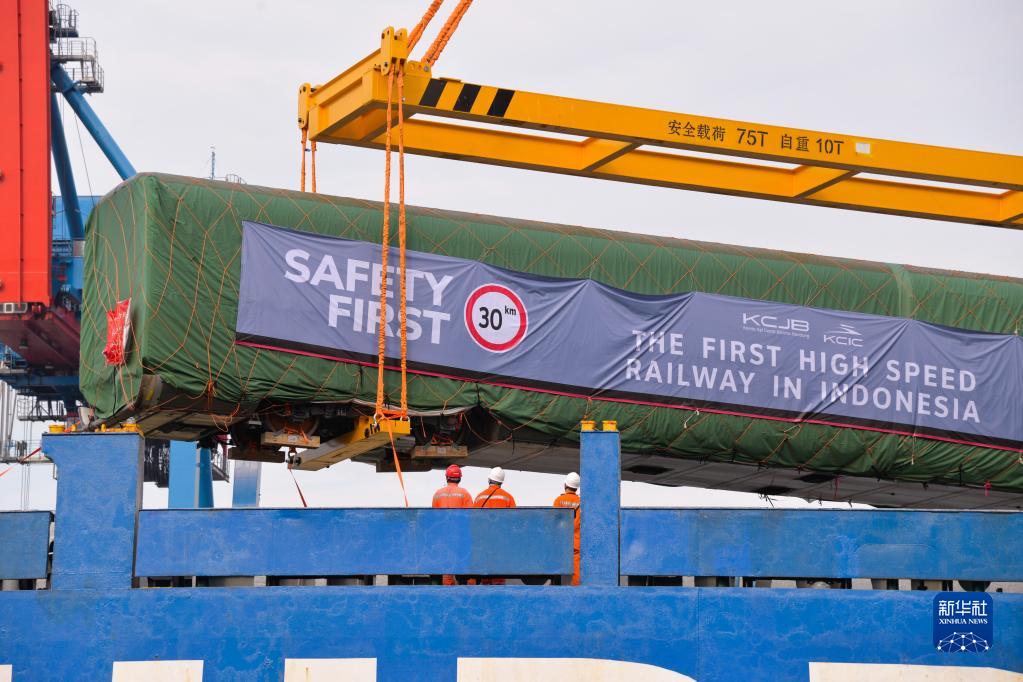 9月2日,在印度尼西亞雅加達丹戎不碌港舉行的運抵儀式上,雅萬(wàn)高鐵高速動(dòng)車(chē)組在港口卸船。