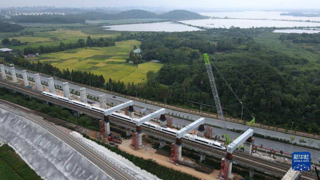 9月3日,一列高鐵列車(chē)經(jīng)過(guò)完成吊裝后的門(mén)式墩鋼蓋梁(無(wú)人機照片)。