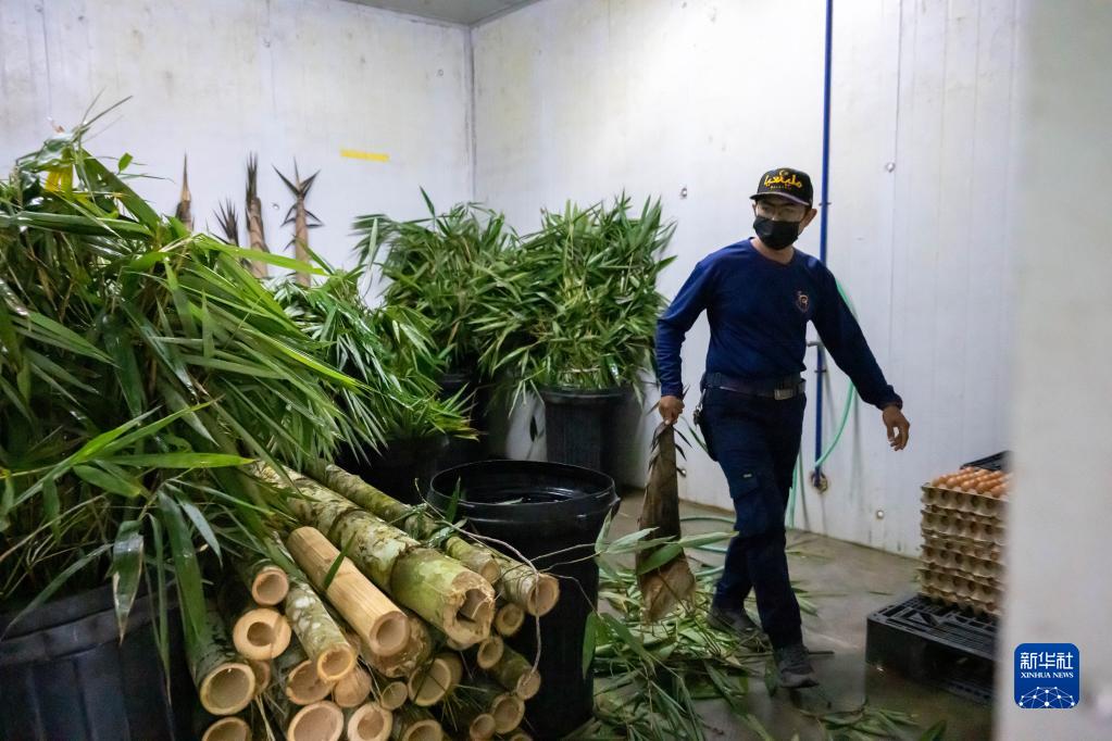 8月21日,在馬來(lái)西亞吉隆坡附近的馬來(lái)西亞國家動(dòng)物園,飼養員阿克邁勒在冷藏室給大熊貓挑選竹子和竹筍。