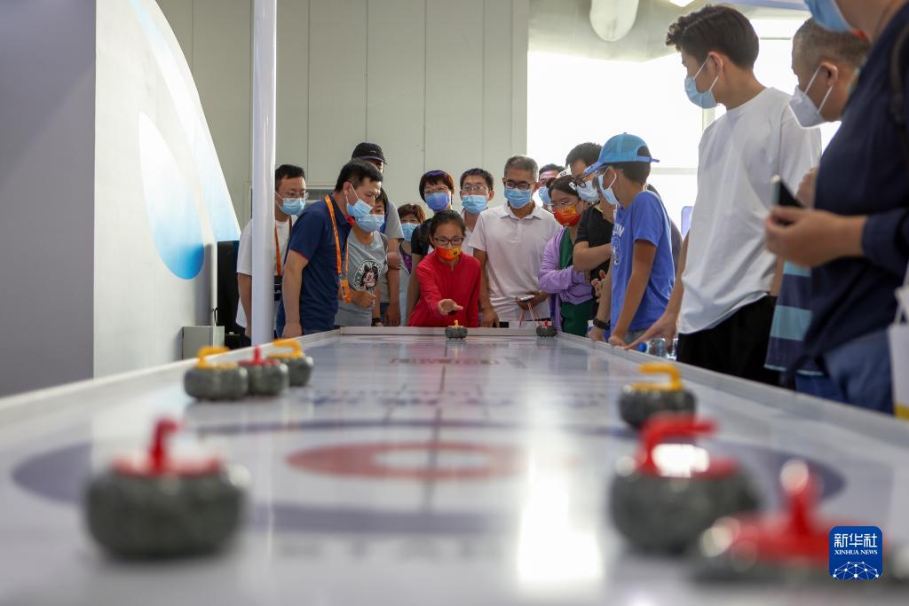 9月3日,觀(guān)眾在體育服務(wù)專(zhuān)題展區體驗臺式冰壺。