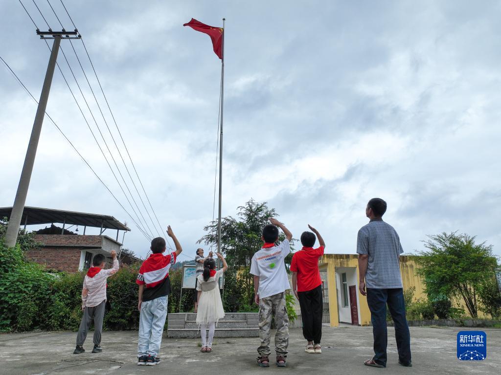 9月1日,在福建省福州市永泰縣白云鄉鳳際小學(xué),兩名老師和五名學(xué)生在舉行升國旗儀式(無(wú)人機照片)。鳳際小學(xué)有兩名老師和五名學(xué)生,學(xué)生均為留守兒童。雖然是一所“微小學(xué)”,但智慧課堂設備、圖書(shū)閱覽室、體育用品等一樣也不少。9月1日,鳳際小學(xué)如期開(kāi)學(xué)。