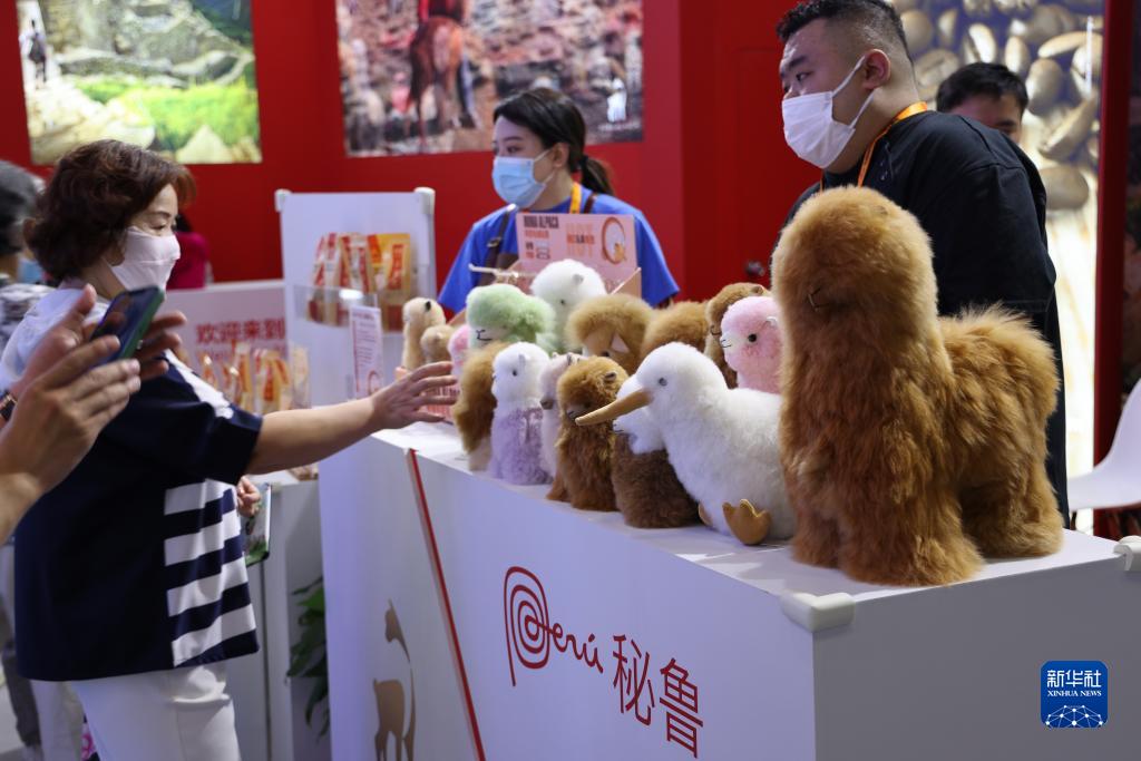 9月3日,參觀(guān)者在服貿會(huì )國家會(huì )議中心展館國別展區秘魯展臺觸摸羊駝毛制成的玩具。