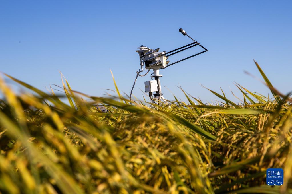 9月2日拍攝的富錦市萬(wàn)畝水稻科技示范園內的氣象監測設備。