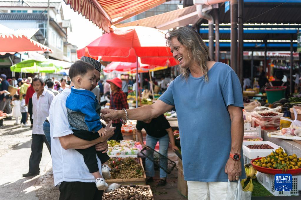 8月28日,林登在喜洲古鎮早市和小朋友打招呼。