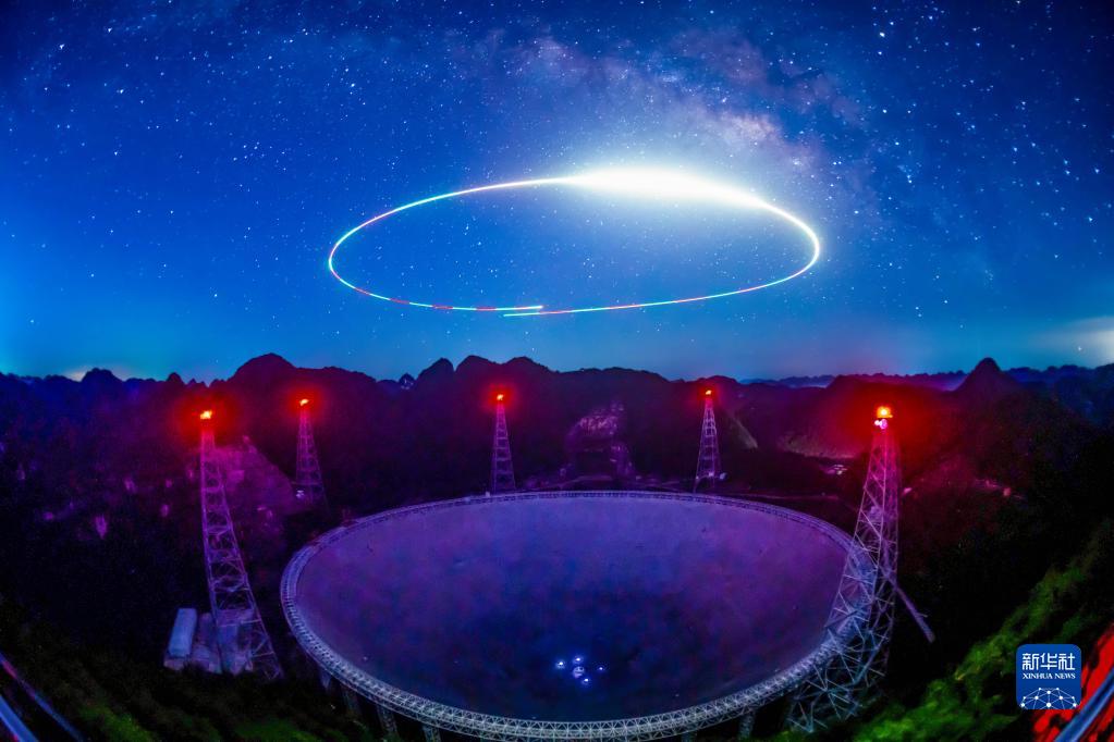 銀河下的“中國天眼”全景(無(wú)人機光繪照片,2022年7月24日維護保養期間拍攝)。