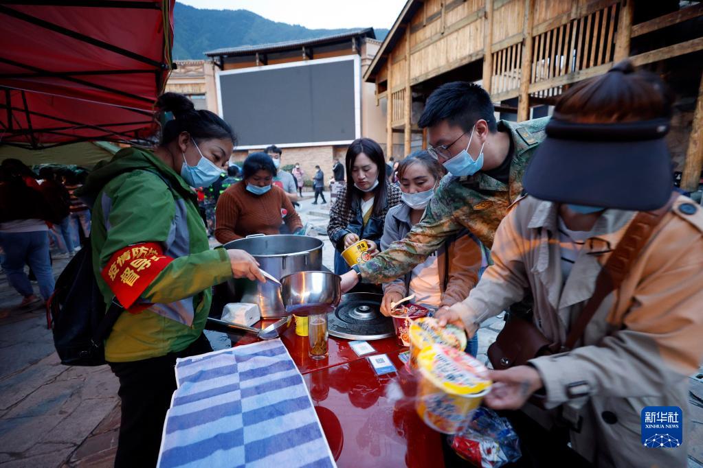 9月5日,在四川甘孜州瀘定縣磨西鎮,工作人員發(fā)放熱水和方便面。