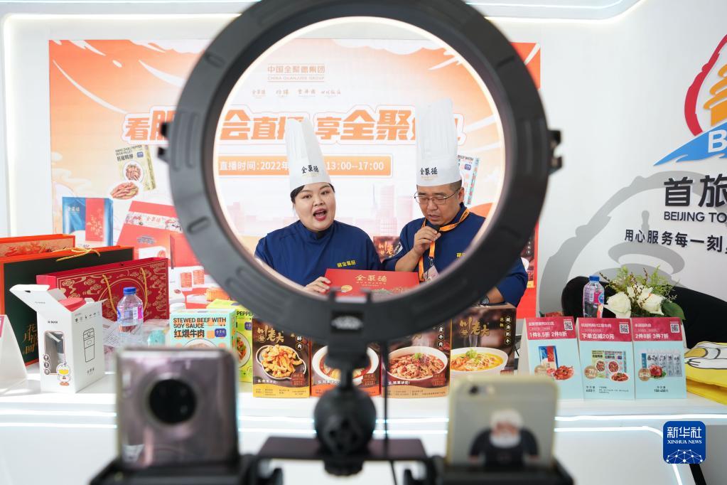 9月1日,在服貿會(huì )首鋼園區文旅服務(wù)專(zhuān)題展,全聚德工作人員在直播推介商品。