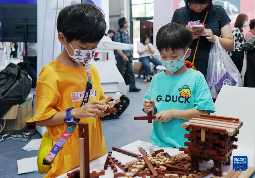 9月5日,小朋友在服貿會(huì )文旅服務(wù)專(zhuān)題展區體驗一款榫卯玩具。