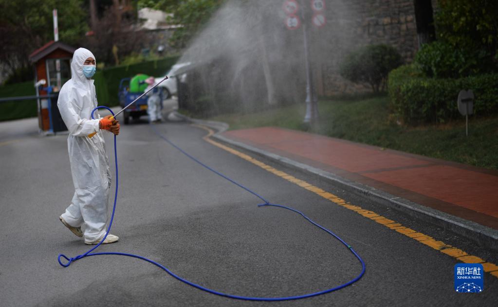 9月5日,志愿者在貴陽(yáng)市烏當區新光路街道一居民小區核酸篩查點(diǎn)進(jìn)行消殺作業(yè)。