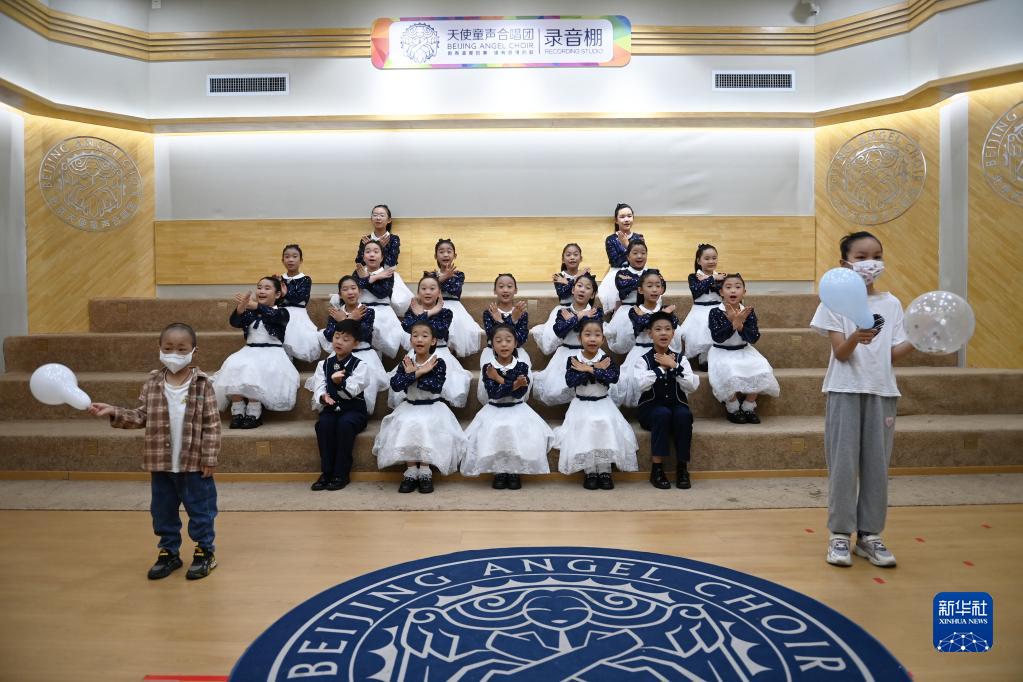 8月29日,在北京市海淀區,羊羊(化名,前左)、淼淼(化名,前右)和天使童聲合唱團成員在錄制歌曲。