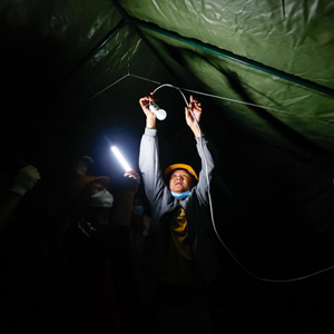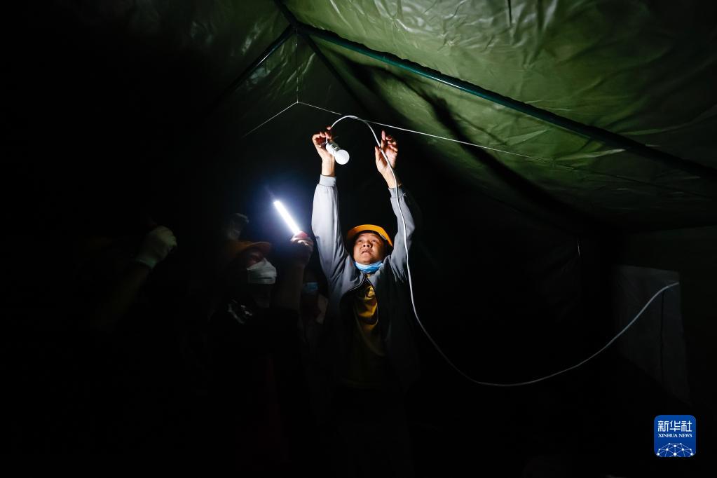 9月5日晚,在四川甘孜州瀘定縣磨西鎮的受災群眾臨時(shí)安置點(diǎn),工作人員安裝電燈。