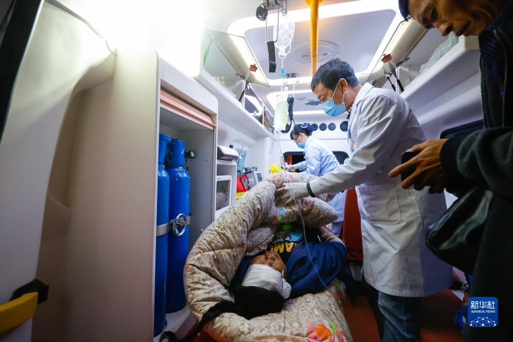 9月5日晚,在四川甘孜州瀘定縣磨西鎮的受災群眾臨時(shí)安置點(diǎn),醫務(wù)人員在轉運傷員。