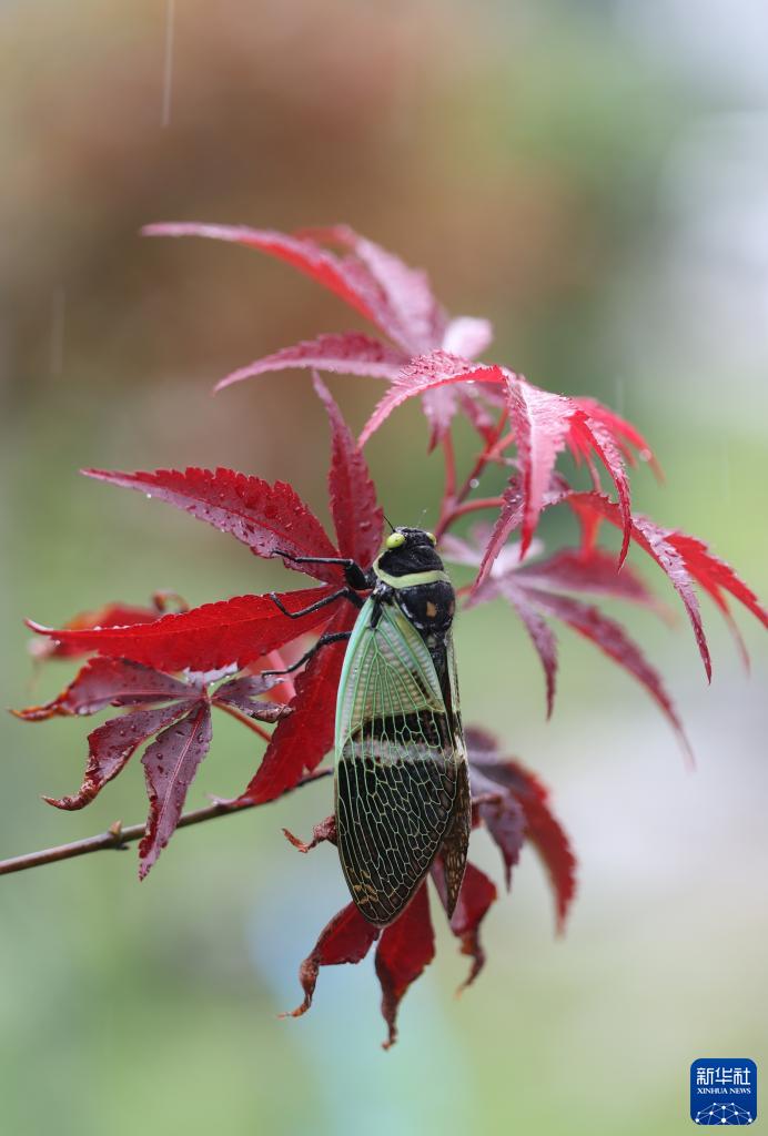 9月4日,在云南省怒江州貢山縣獨龍江公路旁,一只蟬躲在發(fā)紅的楓葉下。