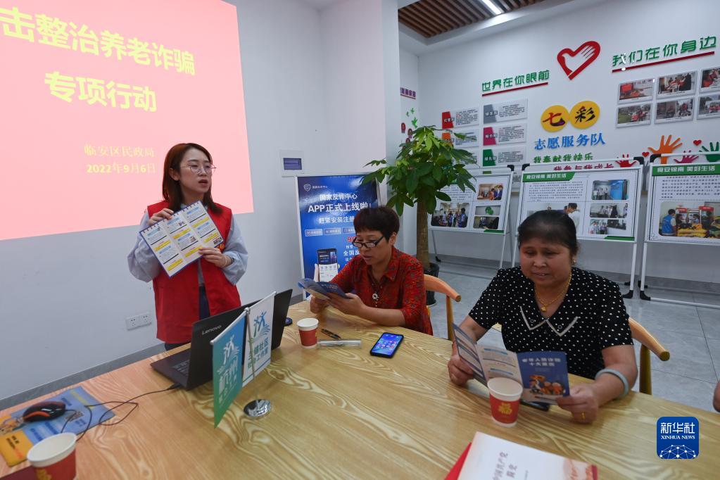 9月6日,在杭州市臨安區錦南街道蘭錦社區黨群服務(wù)中心,黨員志愿者向社區的老年人講解養老詐騙的幾種常見(jiàn)騙局。