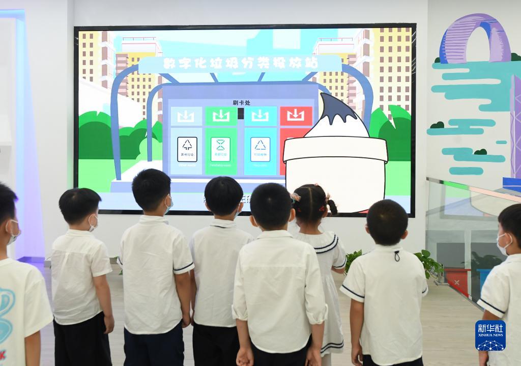 9月6日,在位于湖州吳興區愛(ài)山街道的垃圾分類(lèi)宣教館,孩子們觀(guān)看垃圾分類(lèi)動(dòng)畫(huà)片。