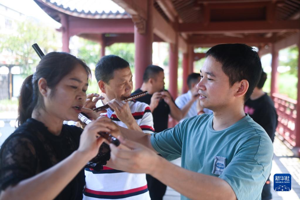 9月6日,竹笛老師劉成(右)在板橋鎮花戲村指導村民學(xué)習演奏竹笛。