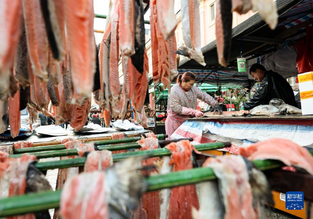 9月4日,在撫遠市東極魚(yú)市,魚(yú)商制作準備晾曬的魚(yú)干。
