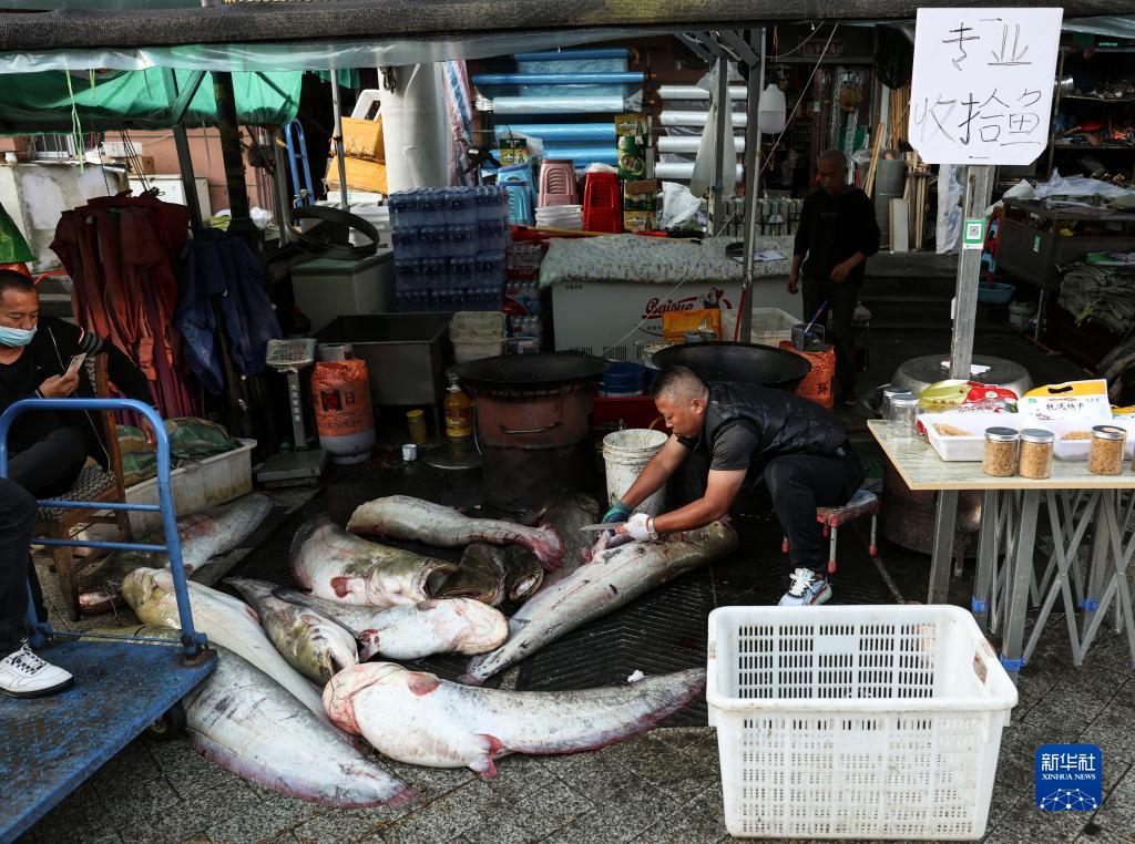 9月4日,在撫遠市東極魚(yú)市,一名魚(yú)商處理送來(lái)的魚(yú)。