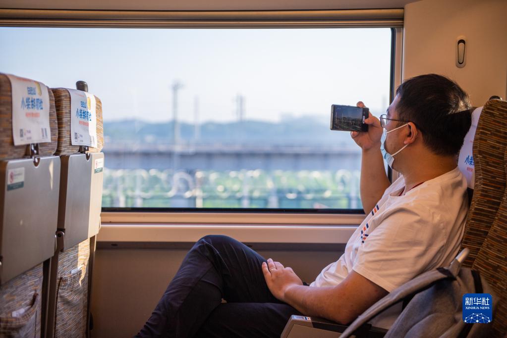 9月6日,在渝廈高鐵益長(cháng)段長(cháng)沙首發(fā)G6518次列車(chē)上,旅客拿手機拍攝窗外風(fēng)景。