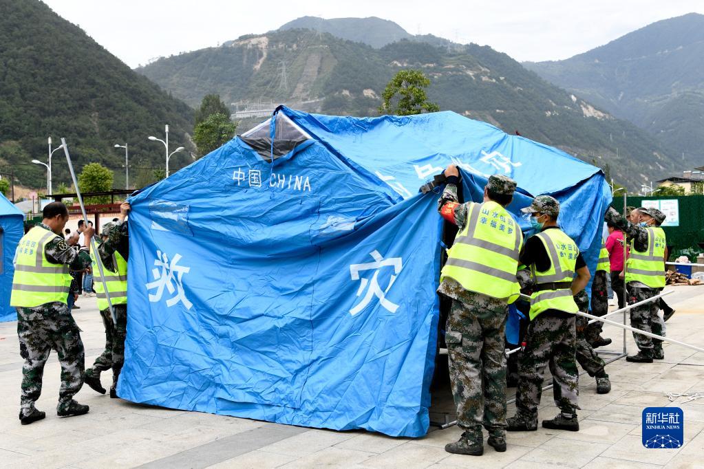9月6日,在位于石棉縣王崗坪鄉挖角村村委會(huì )的安置點(diǎn),救援人員在搭建帳篷。