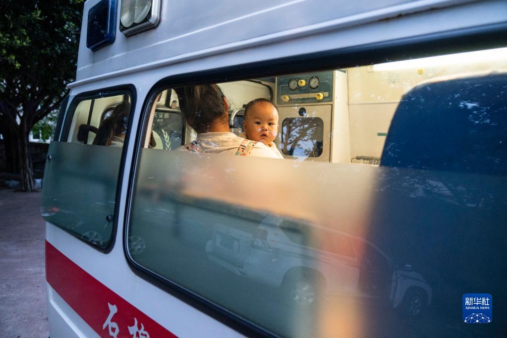 9月6日,在石棉縣中學(xué)的臨時(shí)起降點(diǎn),一名從石棉縣幸福村轉運來(lái)的嬰兒望向救護車(chē)外面。