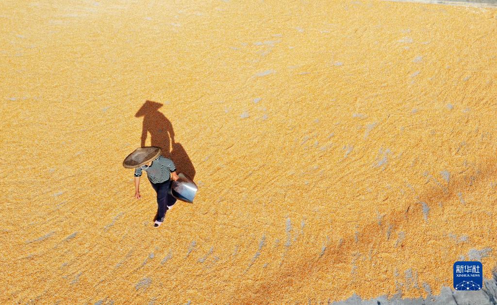 9月6日,農民在貴州省黔南布依族苗族自治州福泉市牛場(chǎng)鎮雙龍村利用空曠場(chǎng)地晾曬玉米(無(wú)人機照片)。