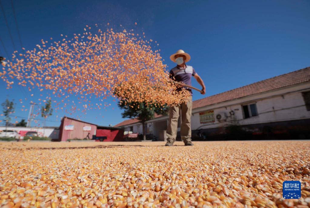 9月6日,河北省遵化市崔家莊鎮大柳樹(shù)村的農民在場(chǎng)院晾曬玉米。