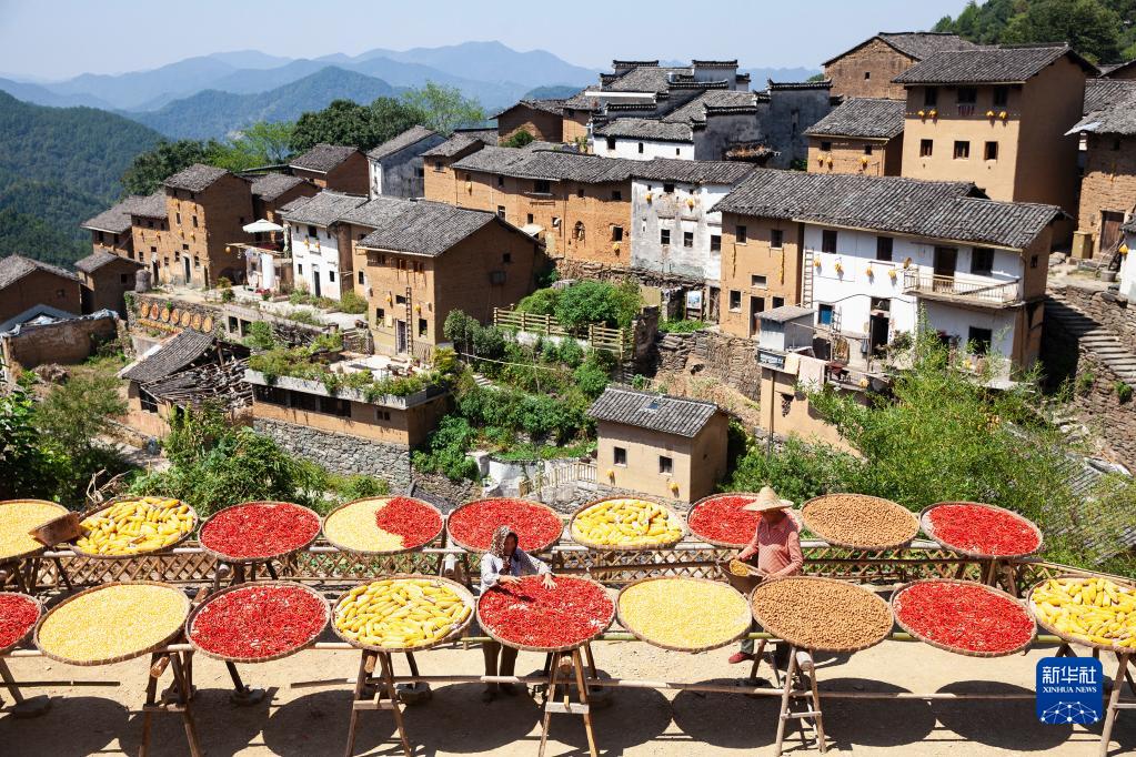 9月6日,安徽省黃山市歙縣陽(yáng)產(chǎn)村村民在曬場(chǎng)上晾曬農作物。