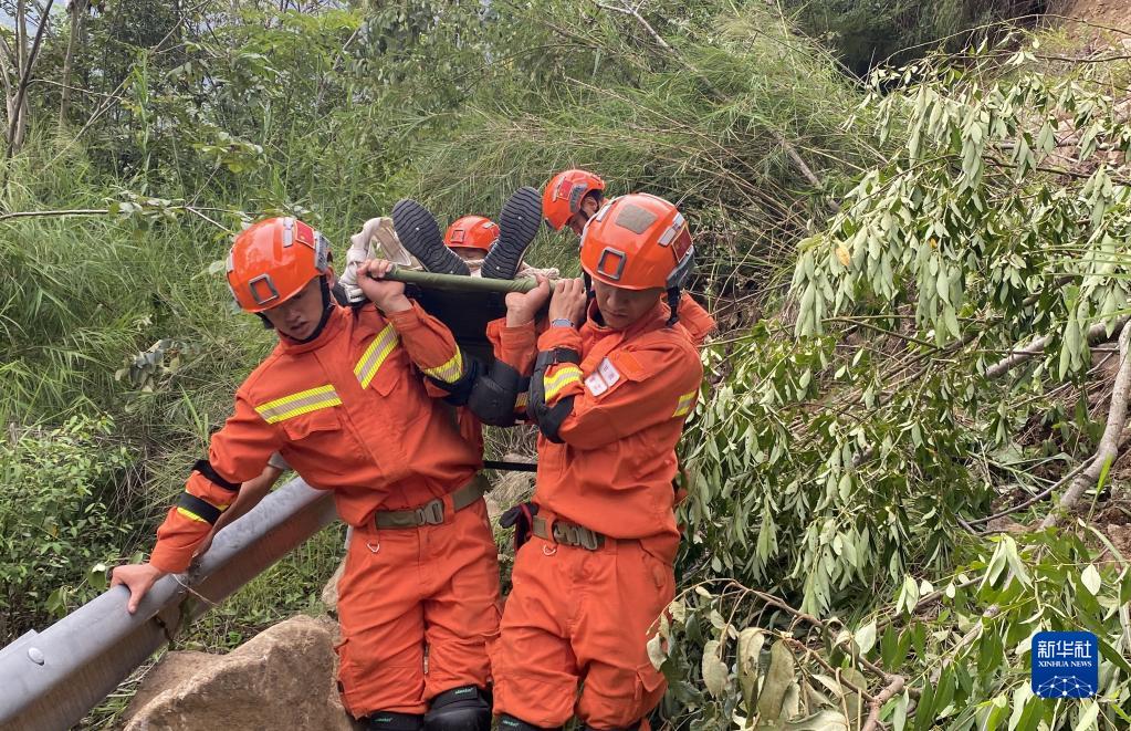 9月6日,四川森林消防總隊甘孜支隊消防員在瀘定縣得妥鎮紫雅場(chǎng)村轉運傷員。