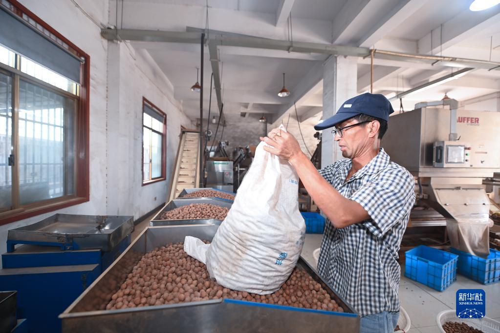 9月7日,在淳安縣臨岐鎮的山核桃“共富工坊”加工企業(yè)內,當地村民加工剛采收的山核桃。