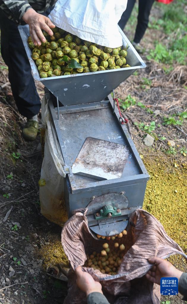 9月7日,淳安縣臨岐鎮審嶺腳村的山核桃林中,農戶(hù)在用脫蒲機把山核桃果的果蒲脫去,留下山核桃籽。