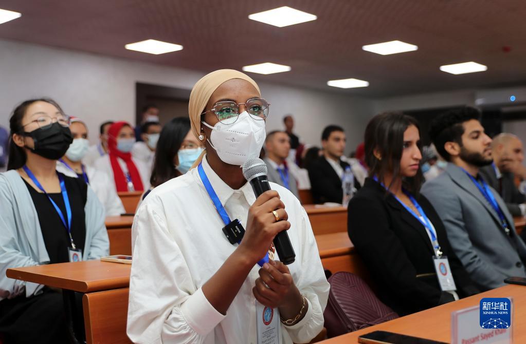 9月6日,在埃及開(kāi)羅的“天宮對話(huà)”活動(dòng)埃及分會(huì )場(chǎng),一名開(kāi)羅大學(xué)青年漢語(yǔ)老師向中國首位女航天員劉洋提問(wèn)。