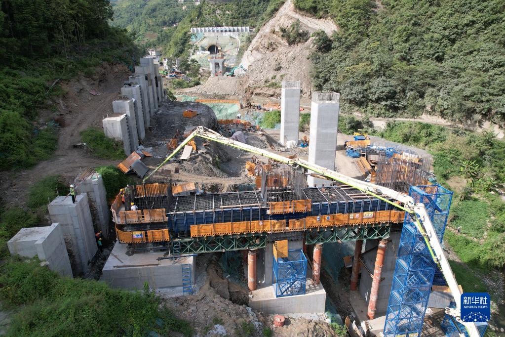 建設中的西康高鐵桐木車(chē)站特大橋(9月6日攝,無(wú)人機照片)。