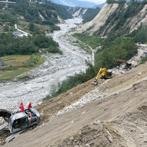 9月7日,在四川省甘孜州瀘定縣磨西鎮附近,四川路橋的工作人員在搶修通往海螺溝景區的道路。
