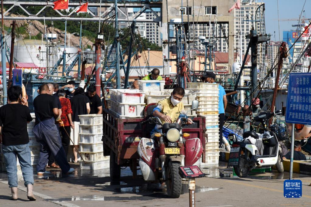 9月7日,在青島西海岸新區積米崖漁港碼頭,魚(yú)販在碼頭進(jìn)貨選購。 新華社記者 李紫恒 攝