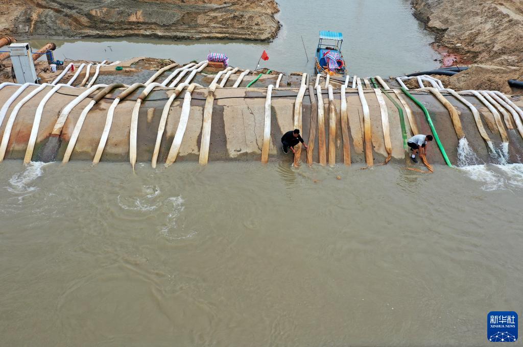 9月8日,在鄱陽(yáng)湖畔的南昌市新建區鐵河鄉一電排站,工作人員從外河引水渠抽水灌溉農田(無(wú)人機照片)。