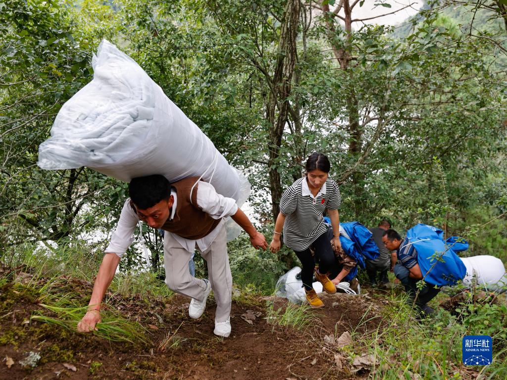 9月8日,在四川省甘孜州瀘定縣磨西鎮附近,救援人員沿著(zhù)臨時(shí)開(kāi)辟的上山小路運送救災帳篷等物資。