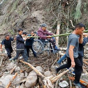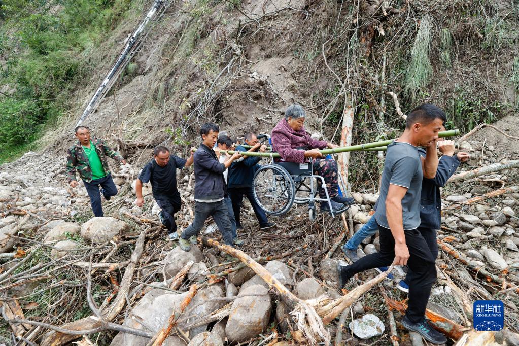 9月8日,在四川省甘孜州瀘定縣磨西鎮附近,人們將一位從磨子溝村疏散出來(lái)的受傷人員抬出。