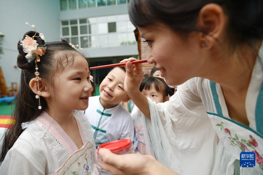 9月8日,江蘇省南京市建鄴區金地名京幼兒園的老師為小朋友點(diǎn)朱砂。