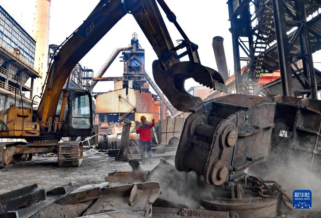 工人在河北省唐山市停產(chǎn)的一家鋼廠(chǎng)拆除煉鋼設備(2018年7月12日攝)。