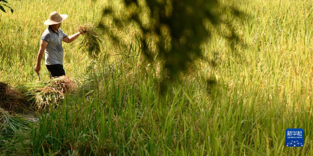 9月9日,在湖南婁底紫鵲界梯田,一位村民在稻田里收割水稻。
