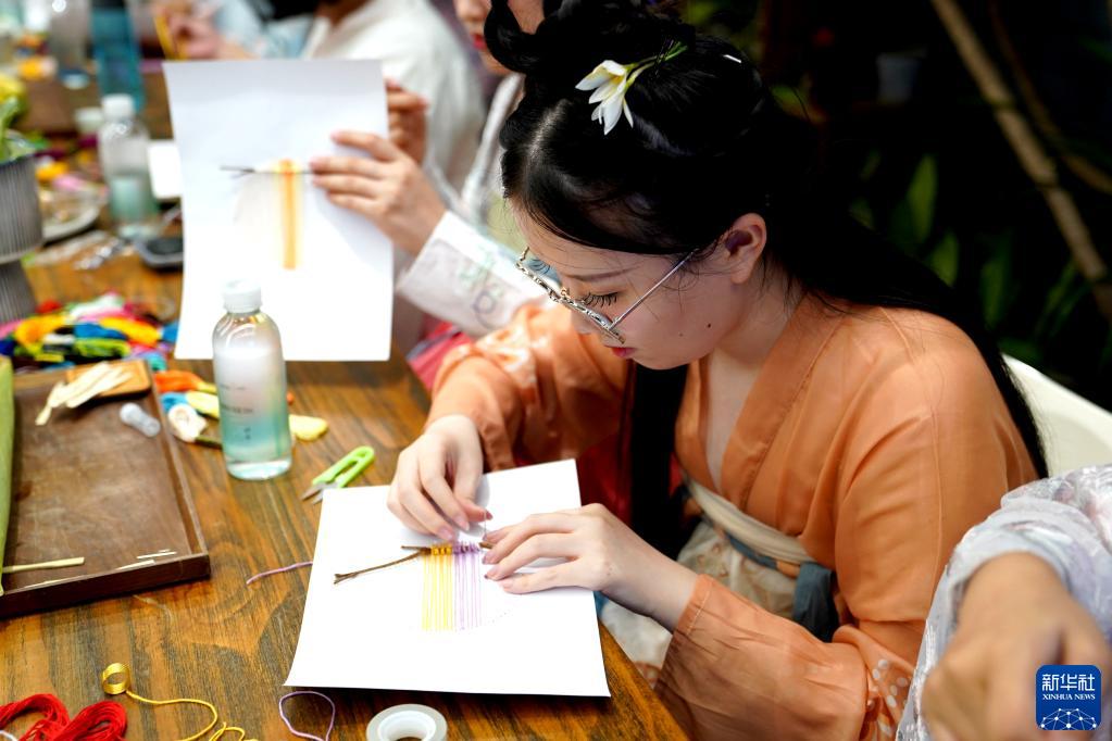 9月8日,身著(zhù)漢服的市民體驗紙上刺繡。