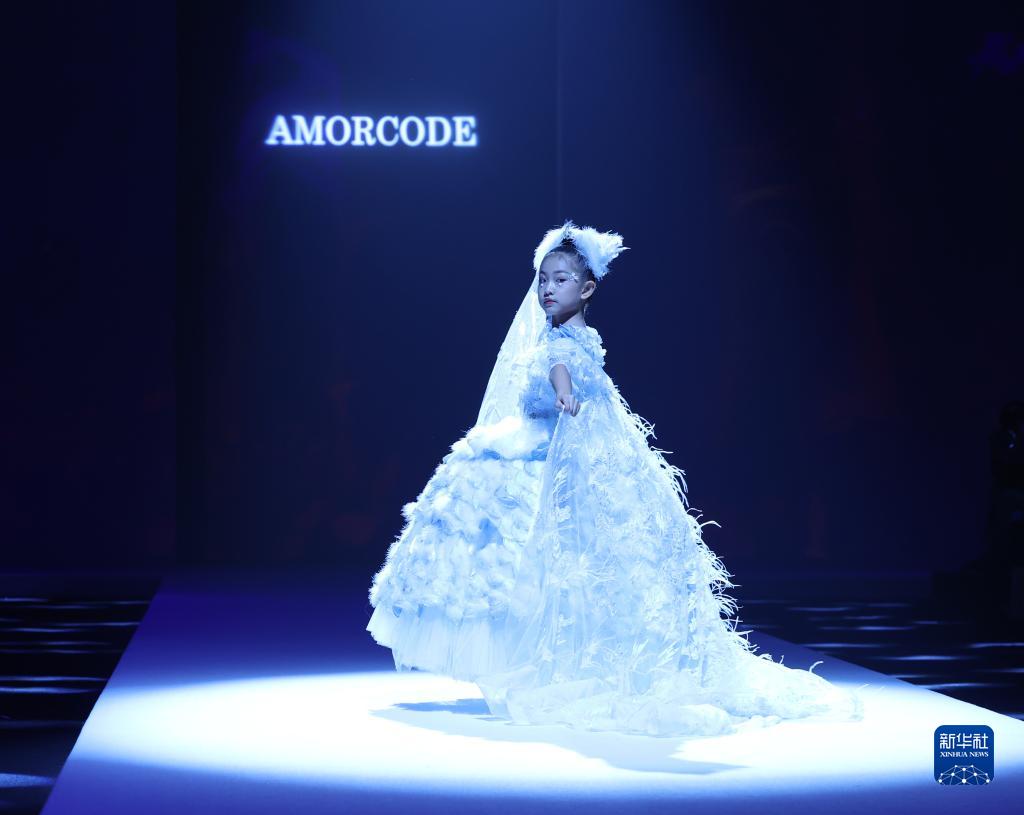 9月9日,小模特在北京中國國際時(shí)裝周(2023春夏系列)舉行的“AMORCODE”童裝發(fā)布會(huì )上展示童裝。