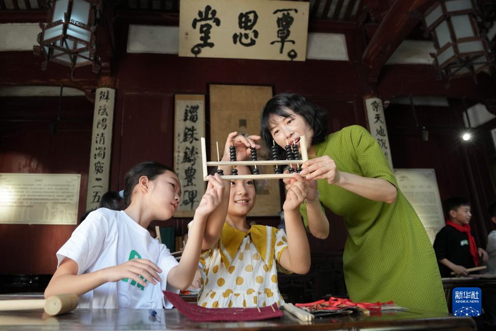 9月7日,在安徽省黃山市程大位博物館,汪素秋在公益珠算小課堂上帶領(lǐng)孩子們制作算盤(pán),培養孩子們對珠算的興趣。
